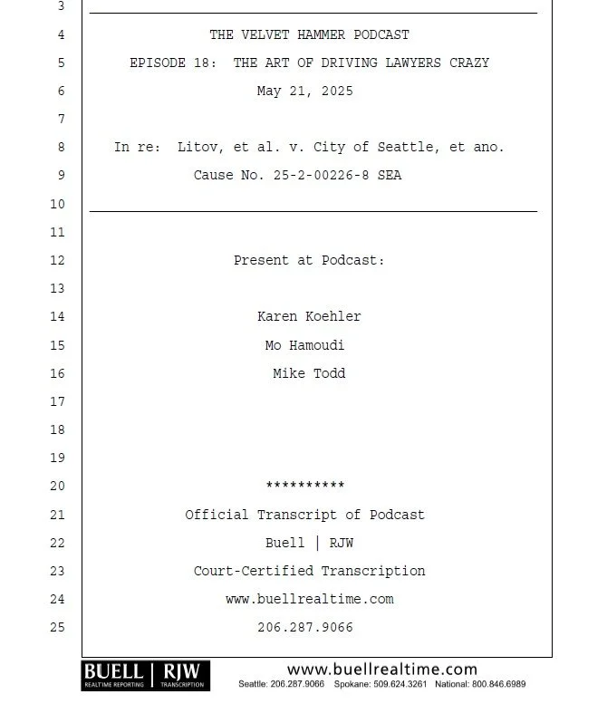 In order to protect the integrity of the legal process, an attorney for the City of Seattle, has scoured through The Velvet Hammer podcasts, to find the perfect 38 page exhibit. The issue: Whether attorneys from the Stritmatter Law Firm are capable of being unbiased enough to push the record button during a zoom deposition.
