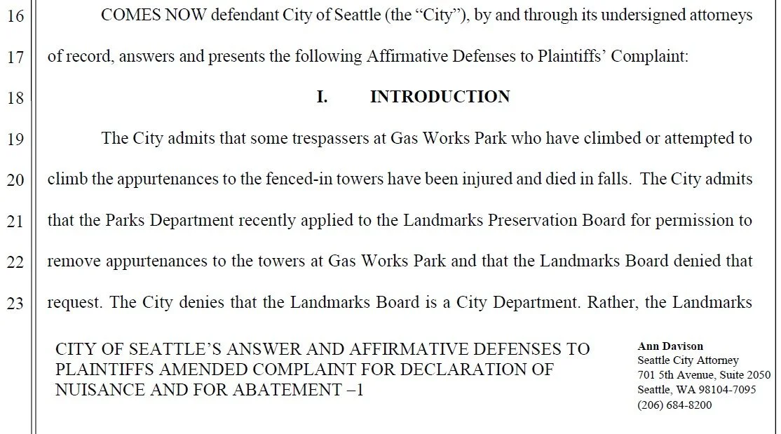 The City fired its opening salvo in the Gas Works Park nuisance lawsuit filed after the death of 15 y.o. Matthies Johnson. This is how the City’s Answer begins: